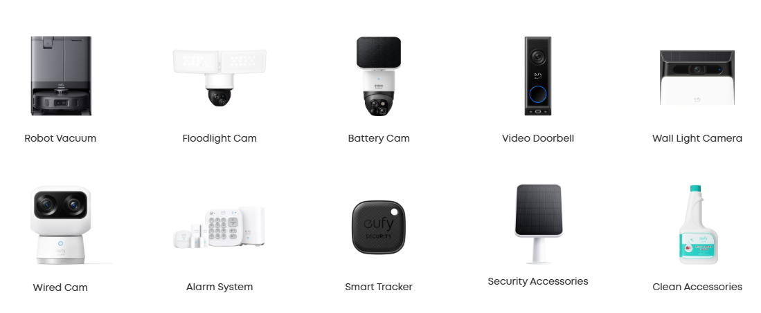 بعد سنوات من التطور، أنشأت علامة Eufy مصفوفة منتجات متكاملة، تشمل روبوتات التنظيف، المكانس الذكية، كاميرات كاشفة، كاميرات تعمل بالبطارية، كاميرات جدارية، كاميرات سلكية، جرس باب مرئي، أنظمة إنذار، متتبعات ذكية، ملحقات أمنية وملحقات تنظيف وغيرها من المنتجات.
