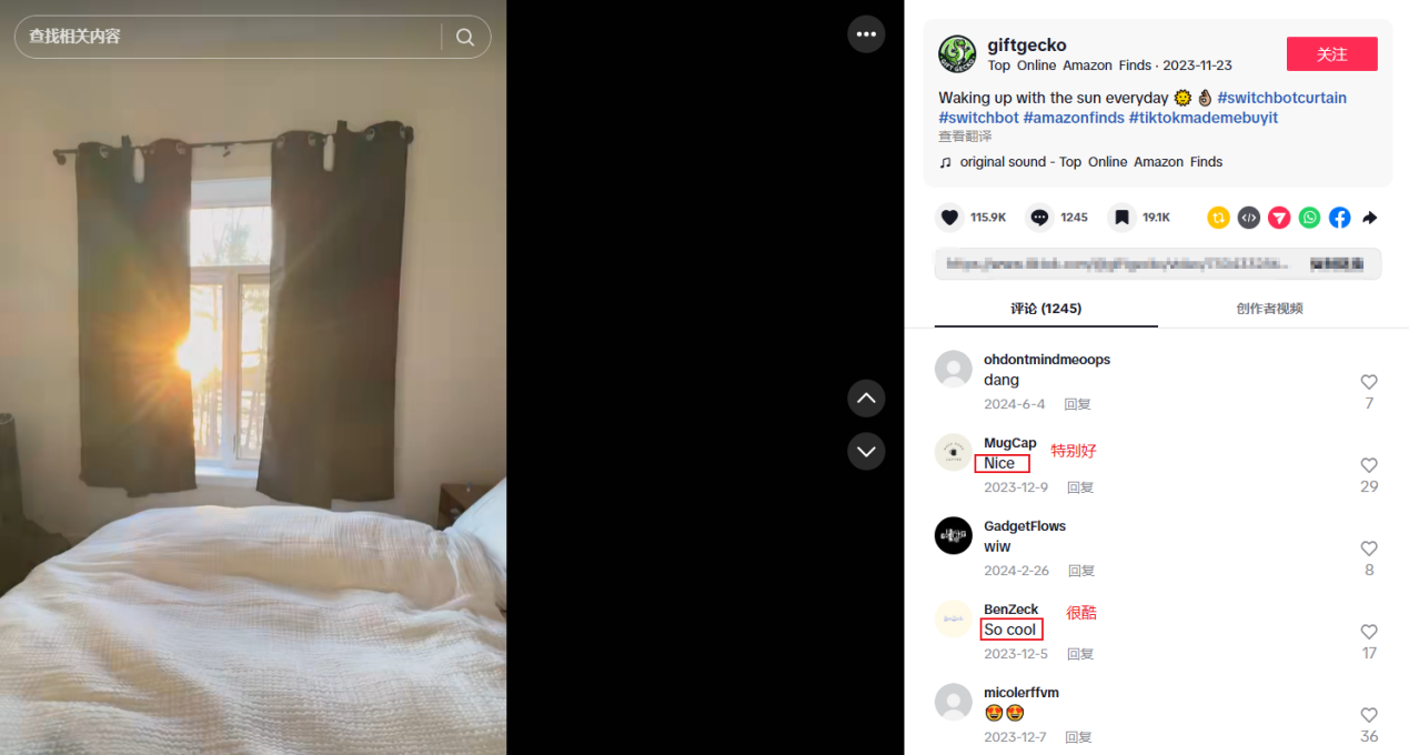 في تعاونهم مع المؤثر التقني @giftgecko الذي يملك 566,900 متابع، عُرض مشهد بسيط لمؤثر يرتدي ملابس النوم ويستخدم تطبيق الهاتف للتحكم في الستائر الذكية وهو على السرير. هذا المشهد اليومي البسيط أصاب نقطة الألم لدى المستخدمين، وحقق في النهاية 5.3 مليون مشاهدة.