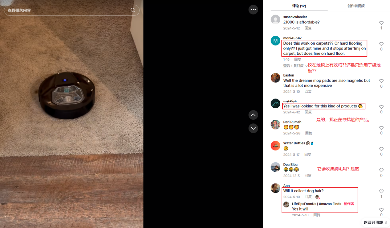 في الفيديو الذي تعاونوا فيه مع المؤثر @lifetipsfromus الذي يملك 821,900 متابع، تم عرض عملية تنظيف شعر الكلاب من السجاد بشكل واقعي، مما أثار تفاعلًا قويًا من أصحاب الحيوانات الأليفة. وتحول قسم التعليقات إلى ساحة لطرح الأسئلة حول المنتج: "هل يناسب القطط ذات الشعر الطويل؟" "هل يمكنه تنظيف بقايا رمال القطط؟" هذه الأسئلة تثبت نجاح تحديد المحتوى، فقد نجحت العلامة في احتلال مكانة في أذهان المستخدمين المستهدفين.