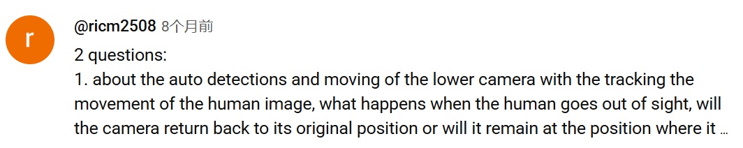 "لدي سؤالان. الأول حول الكشف التلقائي وحركة الكاميرا السفلية، وتتبع حركة صورة الإنسان، ماذا يحدث عندما يغادر الإنسان مجال الرؤية؟ هل تعود الكاميرا إلى وضعها الأصلي أم تبقى في آخر موقع تم فيه اكتشاف الإنسان؟ والثاني إذا كان هناك شخصان يتحركان في اتجاهين مختلفين، أي شخص ستتبعه الكاميرا السفلية؟ هل تختار الكاميرا بشكل عشوائي؟"
