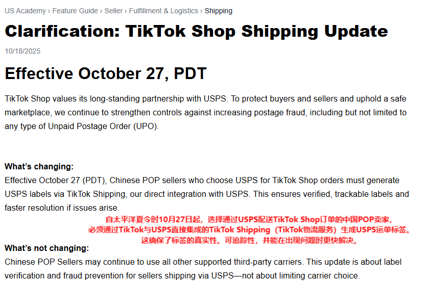 في 17 أكتوبر، أعلن Tuke Shop في أمريكا أنه اعتباراً من 27 أكتوبر 2025 سيجري تعديلات هامة على قواعد الشحن الذاتي للتجار، حيث سيتم تقييد استخدام البريد الأمريكي (USPS) للشحن الذاتي، ويهدف هذا الإجراء إلى تقليل مساحة العمليات المخالفة ودفع معايير تنفيذ اللوجستيات.