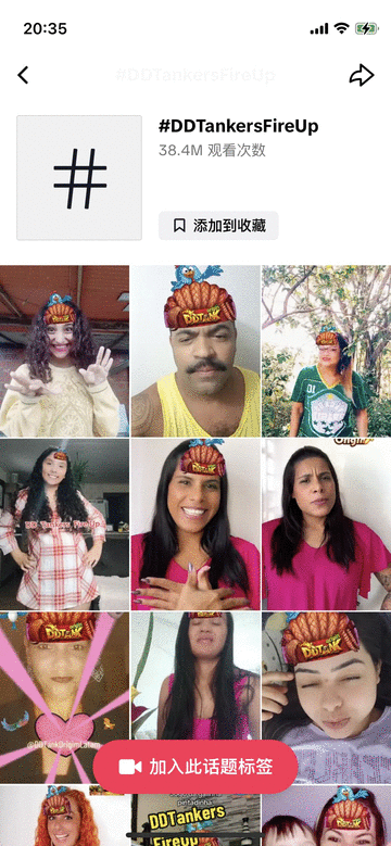 众所周知,巴西民众热情奔放,且偏好音乐,能歌善舞,这也带来了他们对于音乐、舞蹈类短视频内容的极高兴致和互动热情。在了解到《弹弹堂》手游与巴西国民级卡通 IP “Galinha Pintadinha Chicken” 有合作关系后,TikTok for Business 建议第七大道善用 TikTok 平台有声沉浸的优势,使用该 IP 脍炙人口的主题曲与游戏形象做结合:以 Upa Cavalinho 为 #DDTankersFireUp 挑战赛的背景音乐,《弹弹堂》手游的 logo 及 Galinha Pintadinha Chicken 形象组合设计帽子造型的互动贴纸。视听融合的方式将《弹弹堂》手游与 Galinha Pintadinha Chicken 深入绑定,让巴西人民每当听到曲子就可以想到该款游戏。后期的数据显示,93%参与本次挑战赛的用户使用了建议的背景音乐,进一步验证了当地用户对于 Galinha Pintadinha Chicken 的偏好以及该 IP 与游戏的适配性。