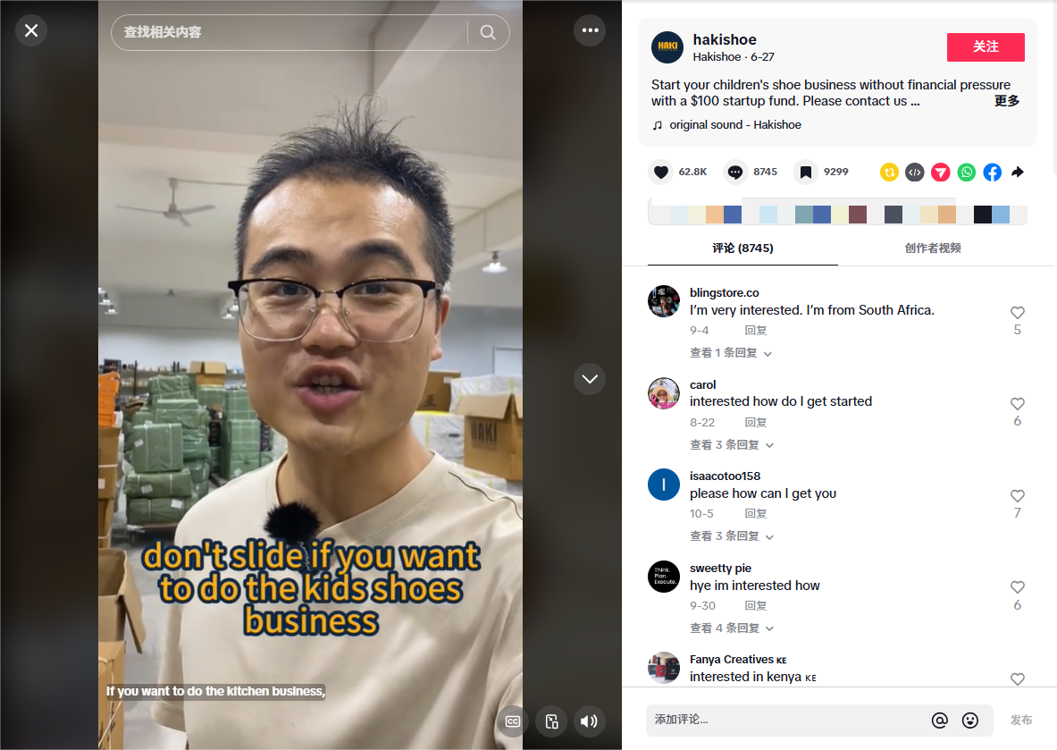 Unlike some accounts that only do hard product ads, HAKI SHOE children's shoe factory presents its production process, product displays, and even real customer feedback one by one on TikTok. These contents published on TikTok have also brought good inquiry results to HAKI SHOE children's shoe factory. For example, this video with 1.3 million views received 8,745 comments, many of which contained useful customer inquiry information.