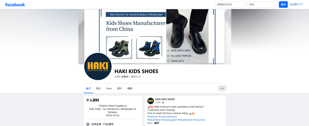 In addition, HAKI SHOE children's shoe factory also promotes its products through different social media platforms, achieving a multi-platform layout. They have opened an account on Facebook and gained 4,467 followers.