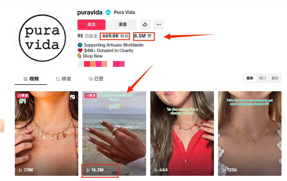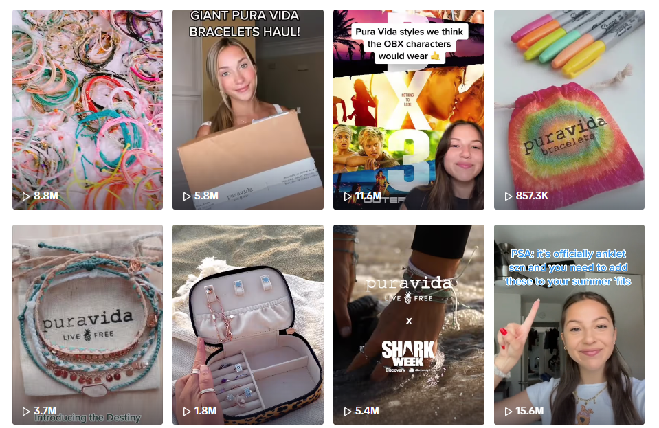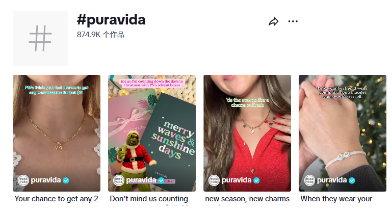 In addition, Pura Vida has set up a dedicated brand hashtag "#puravida" on TikTok, encouraging users to share photos of themselves wearing the products, and continuously collecting and reposting these contents through the official account to promote the products and increase brand exposure.