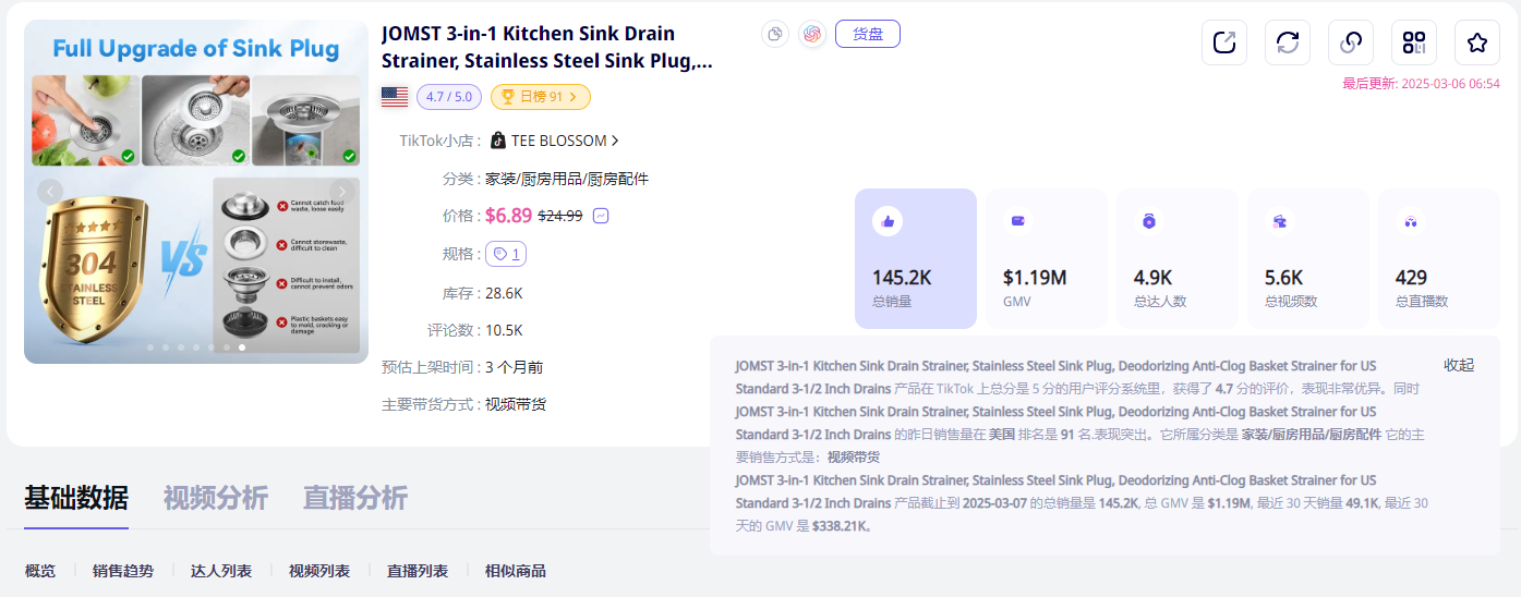 Data shows that total sales of this sink filter have exceeded 145,200 units, with total GMV reaching $1.19 million, which is an excellent result for a niche product.