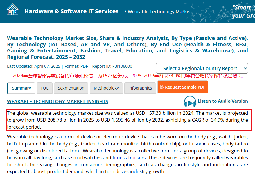 According to the latest data released by fortunebusinessinsights, the global market size of smart wearable devices is estimated to reach $157.3 billion in 2024, and is expected to maintain steady growth at a compound annual growth rate of 34.9% from 2025 to 2032.