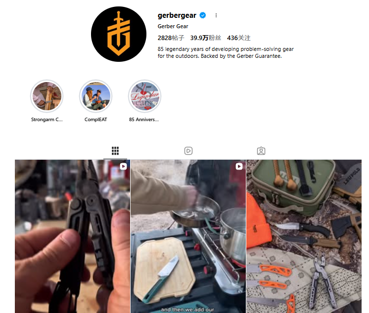 OnInstagram, Gerber's official account @gerbergear has about 399,000 followers, with over 2,800 posts, forming a large-scale library of graphic and video content assets.