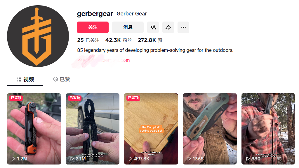 Currently, the brand's officialTikTok account @gerbergear has gained 42,300 followers and about 272,800 likes. In the official profile, they directly emphasize "85 years of honing outdoor gear that solves problems," reinforcing historical accumulation and professional identity.