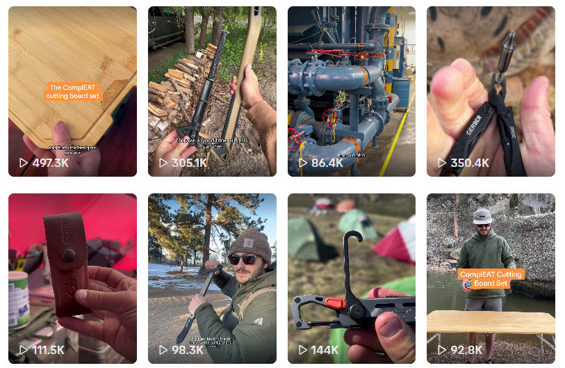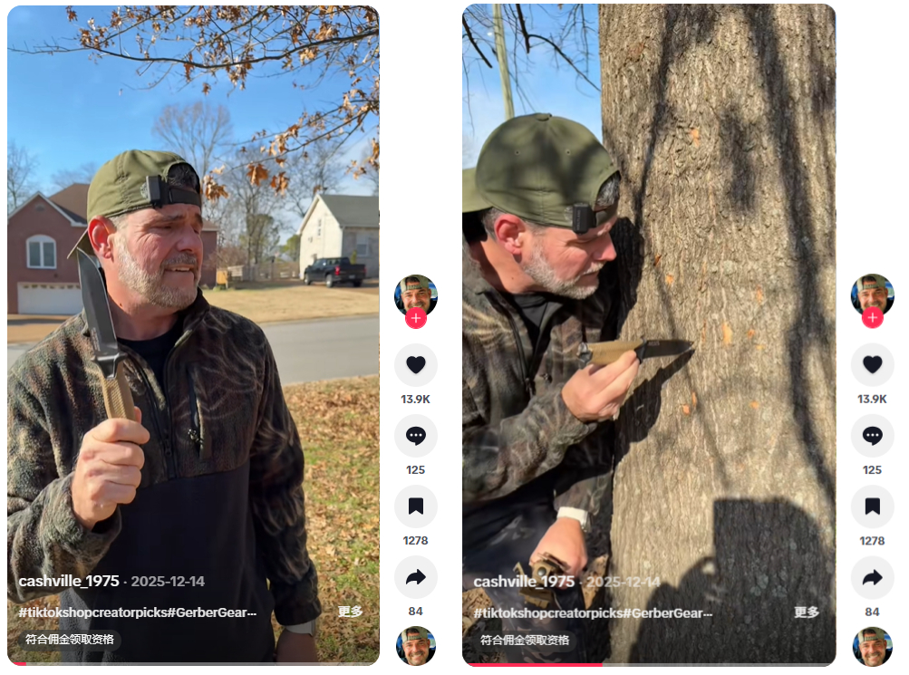 TikTok influencer @cashville_1975 is a good example. In a video in collaboration with the brand, he repeatedly throws a Gerber tactical knife at a tree trunk to test the toughness of the blade.