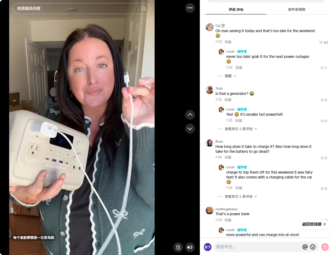 Moreover, in the comments section, many fans actively asked about product details such as charging speed and output power, and @carahellis replied to each one, helping potential buyers clarify their decision doubts.