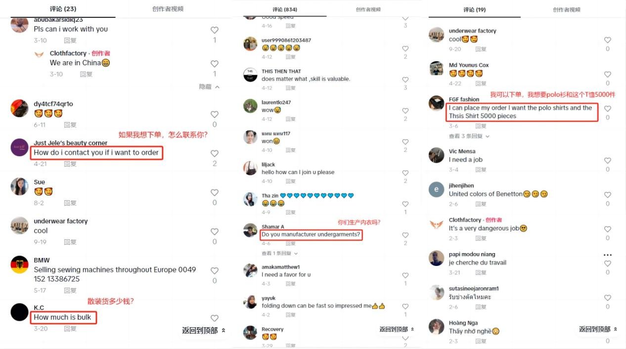 Opening the comment section of Kuang Kuang's Tuke account @garmentfactory66 videos, we can see that many customers are interested in cooperation and are leaving inquiries.