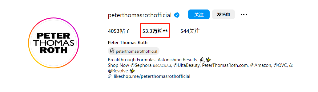 Additionally, Peter Thomas Roth regularly collaborates with various overseas influencers to promote products, leveraging their wide reach to advertise its offerings.