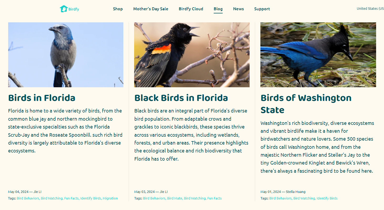 In addition, Birdfy's official site has a dedicated Blog, sharing brand stories, bird knowledge, and environmental concepts, building a large home for birdwatching enthusiasts and attracting many consumers who care about the environment and nature.