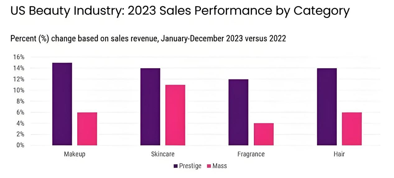 Reportedly, in 2023, sales in the high-end beauty industry increased by 14% year-on-year, and total U.S. beauty sales are expected to reach $31.7 billion. Among them, high-end cosmetics sales grew the fastest, with a year-on-year increase of about 15%; mass-market beauty sales also achieved a growth of about 6%.