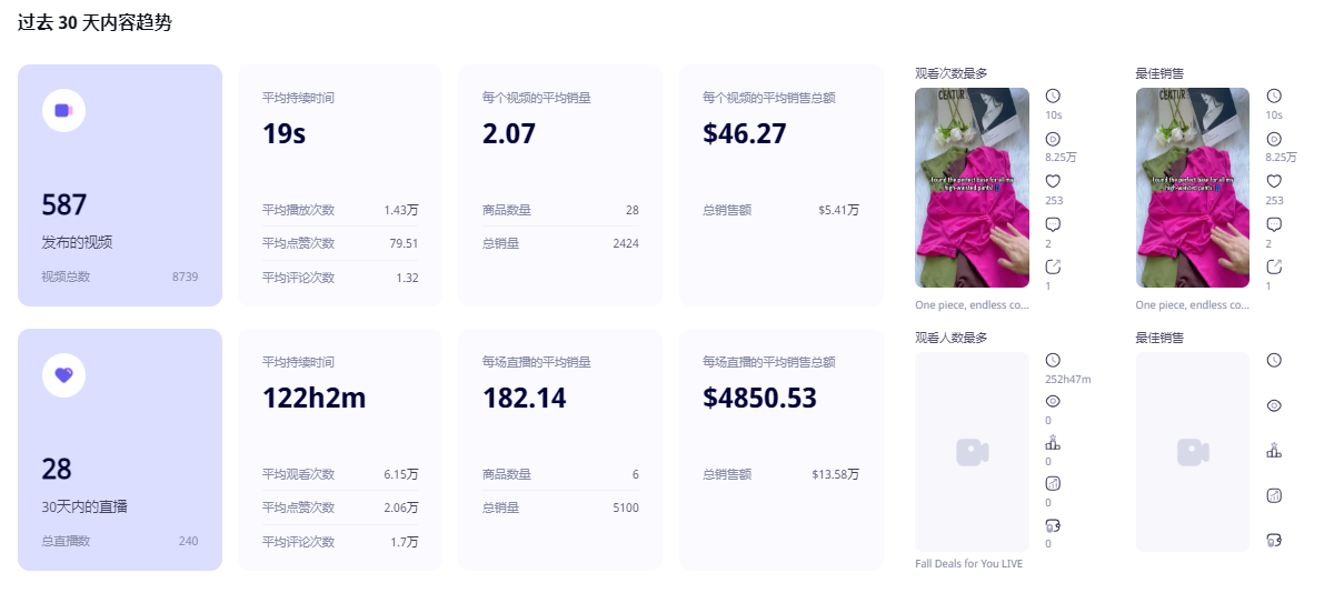 Esto también se refleja claramente en los datos: en los últimos30 días, este perfil ha publicado 587 vídeos y realizado 28 transmisiones en vivo, logrando ventas por vídeo de 135,800 dólares y ventas promedio por transmisión de 4,850.53 dólares, lo cual es un buen resultado para una sala de transmisión propia de la marca.