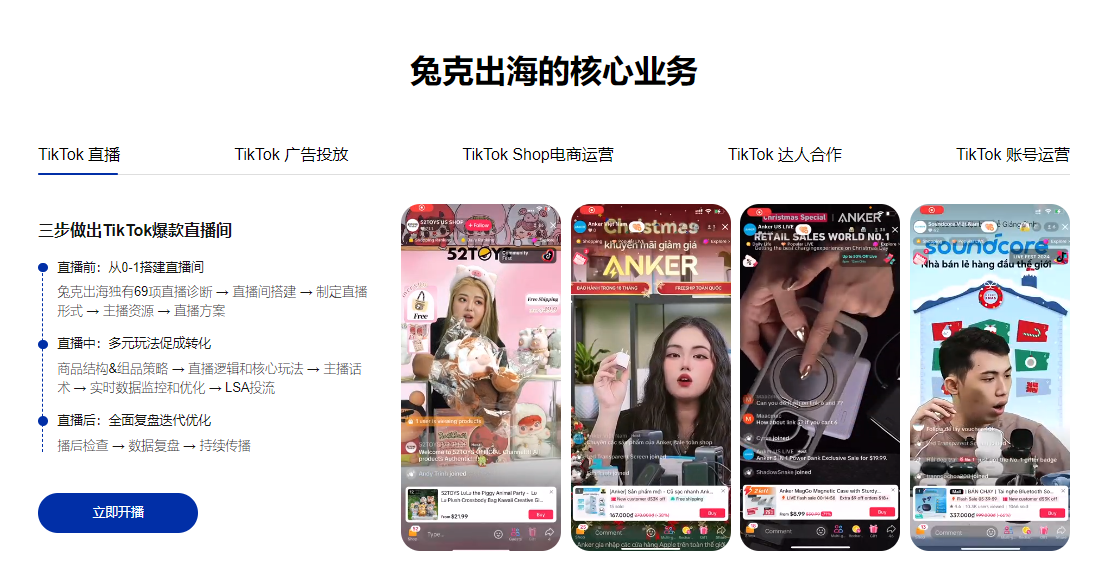 3. Un service sur toute la chaîne réduit le coût des essais-erreurs : Une simple diffusion publicitaire ne suffit plus aux besoins des entreprises. Un prestataire de publicité TikTok de qualité doit couvrir toute la chaîne : gestion de compte + production de contenu + diffusion publicitaire + marketing d’influence + vente en direct.