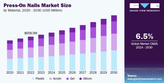 Grandviewresearchのデータによると、2023年、世界の付け爪市場規模は6億9660万ドルと推定され、2024年から2030年にかけて6.5%の年平均成長率で拡大する見込みです。