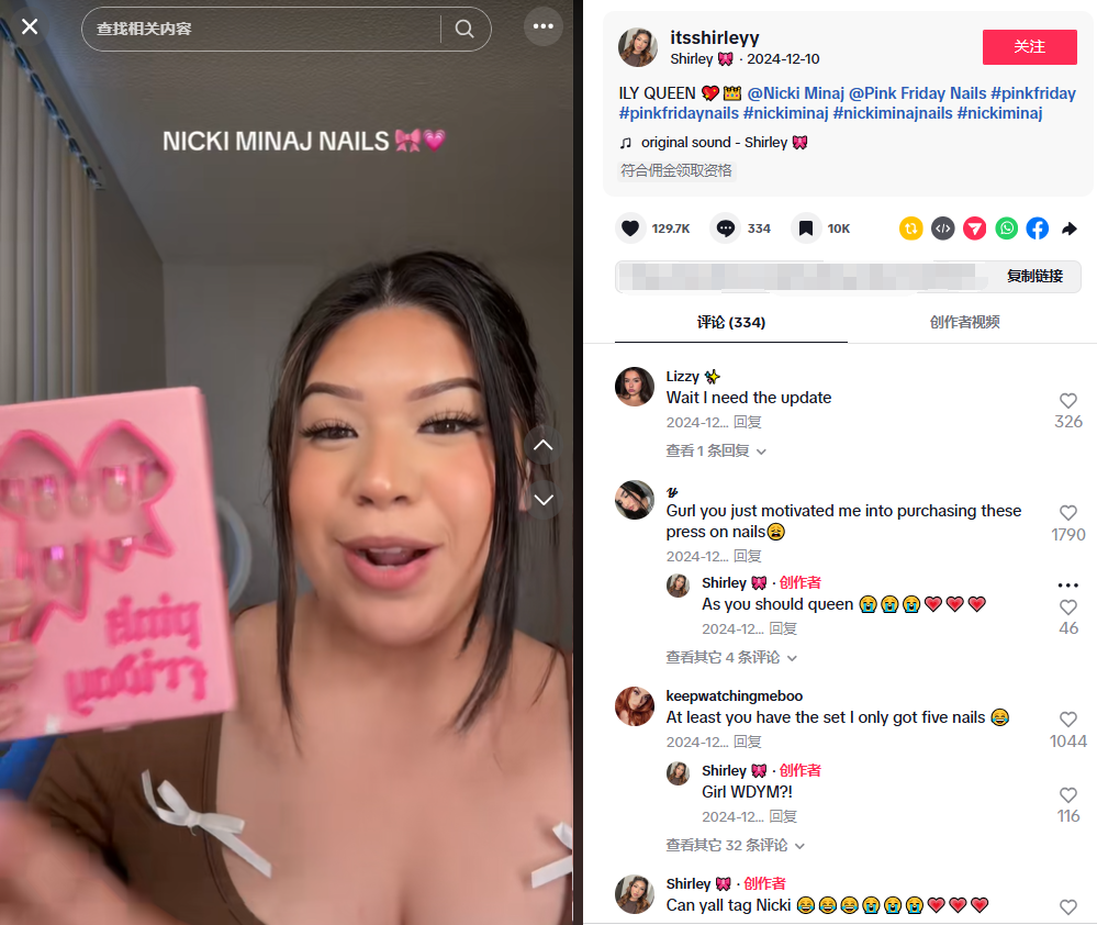 例えば、Pink Friday Nailsとコラボしたインフルエンサー@Shirley(1.04万フォロワー)が投稿した開封動画は、タイトルに「Nicki Minaj Nails」を使い、再生数は140万、いいね数は12.97万を超えました。