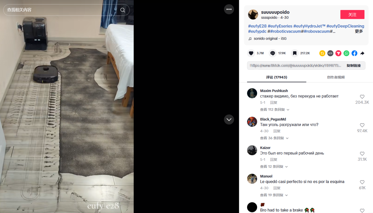 Eufyがコラボした掃除系インフルエンサー@suuuuupoidoは、フォロワー21.72万人しかいませんが、再生回数1億2480万回のバズ動画を生み出しました。動画には複雑な説明はなく、ただ一つのシーン:インフルエンサーがEufy掃除機で16秒で埃だらけの寝室を掃除するだけ。このリアルな掃除シーンが「掃除が面倒」というユーザーの悩みに直撃し、「吸引力が強く、スピードが速い」という製品の強みが一目で分かります。トップインフルエンサーの洗練された広告よりも、こうした生活感あふれる短い動画の方が、「本当に使える」とユーザーに信じさせる力があります。