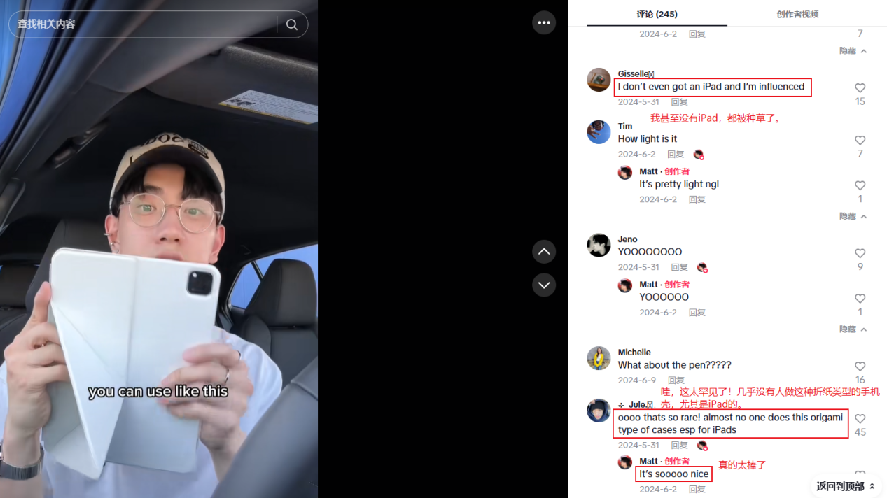 デジタルアクセサリーブランドPITAKAがコラボした@cha.siuuは、フォロワー25.53万人。動画ではただ一つのことをしています:iPadスタンドの柔軟な使い方をデモ。横向きにしてドラマを見たり、縦向きにしてメッセージを見たり、4つの調整可能な角度のデザインが分かりやすく紹介されています。この動画は技術的なスペックには一切触れず、「一つで多用途」というコアな強みだけを強調し、再生回数180万回を記録。ユーザーからは「iPad持ってないのに欲しくなった」というコメントも。このように売りに特化したデモは、「便利で実用的なものが欲しい」というユーザーのニーズに的確に刺さり、長々とした広告よりもはるかに効果的です。