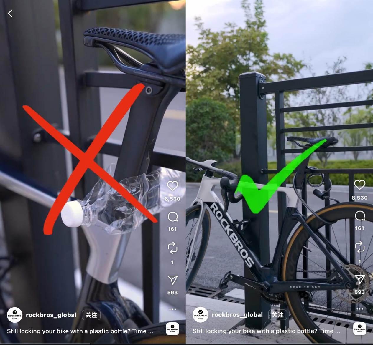 自社のロックを紹介する短い動画は典型的で、内容はシンプルで、正しいロック方法と間違ったロック方法を比較して製品情報を伝えています。間違った例では、ペットボトルを切ってキャップで固定するという創意工夫を使い、ユニークな対比で新鮮さと記憶に残るポイントを生み出しています。