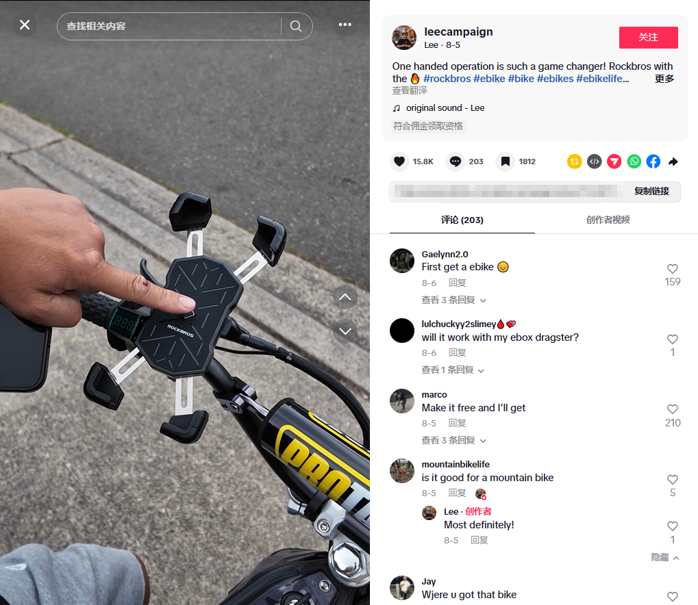 さらに、Rockbrosはサイクリング分野のインフルエンサーとのコラボでも顕著な成果を上げており、例えば18.2万人のフォロワーを持つ@leecampaignとの製品紹介動画は、70.56万回再生と1.58万回のいいねを獲得しました。