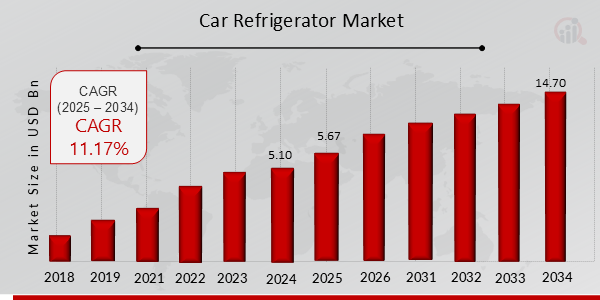 Market Research Futureのデータによると、2024年の世界の車載冷蔵庫市場規模は51億ドルと評価されており、2025年から2034年にかけて年平均複合成長率は11.17%になると予測されています。