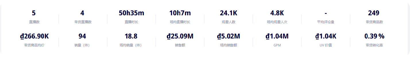 もちろん、最終的な成果も素晴らしく、データによると、最近の5回のライブ配信の総時間は50時間35分、1回あたり平均10時間以上、総売上は2509万ベトナムドン、1回あたり平均売上は502万ベトナムドンで、継続的な運営による安定した成果を示しています。