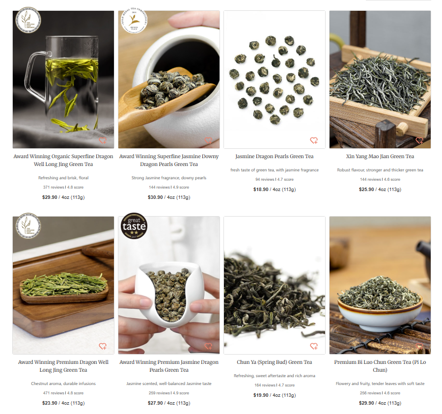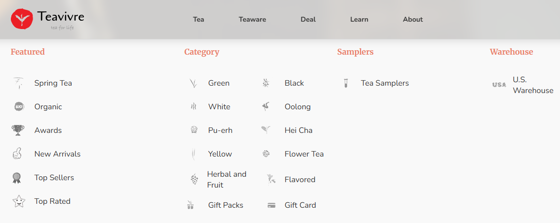 独立サイトのトップページでは、TeaVivreは明確な製品カテゴリーエリアを設け、茶葉を10種類に細分化し、ギフトセットも提供しています。この明確な分類は、消費者が必要な商品を迅速に見つけるのに役立ちます。