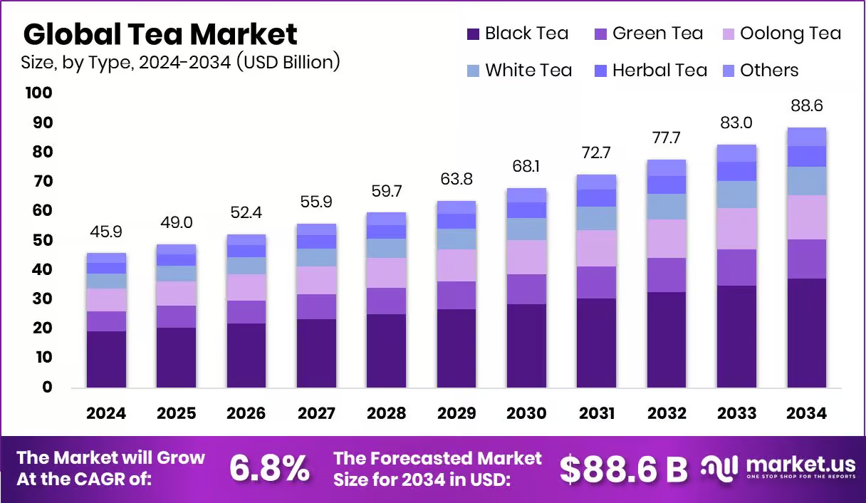 2034年には、世界の茶市場の価値は約886億米ドルに達すると見込まれています。