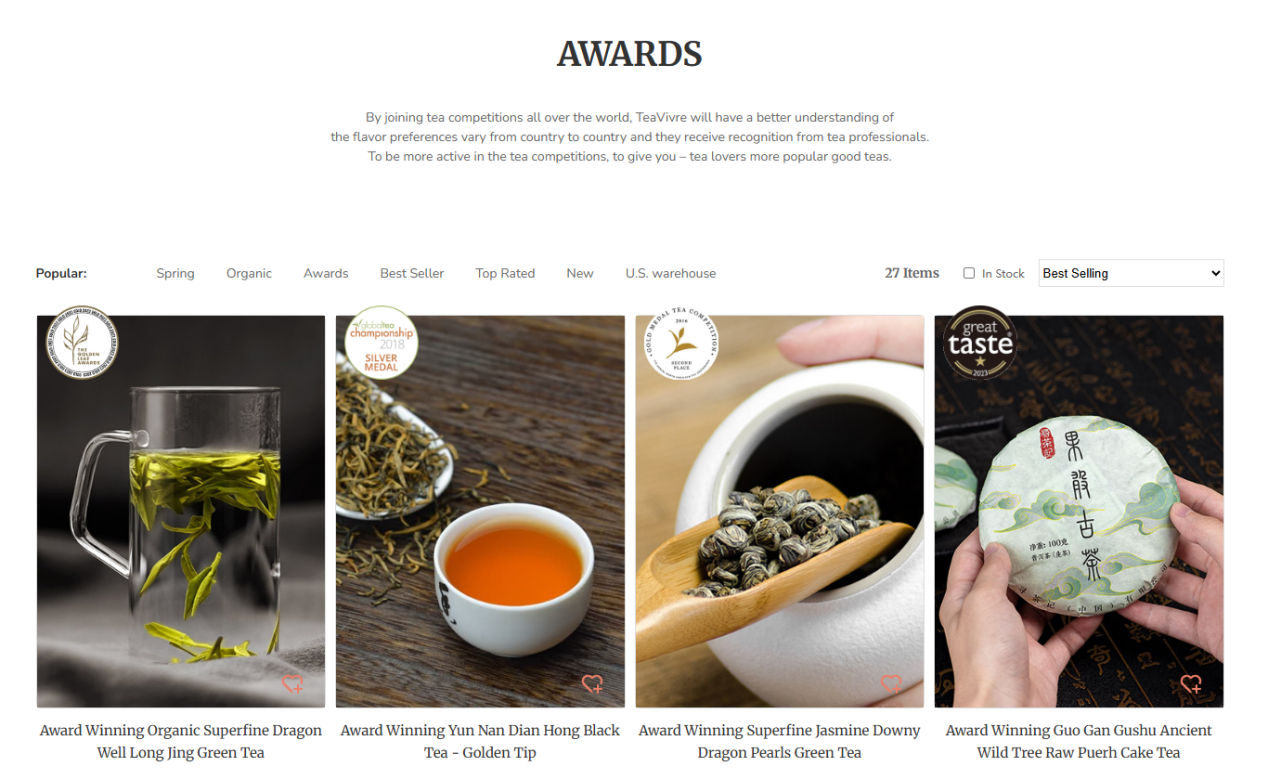 長年の発展を経て、TeaVivreは世界の茶コンテストで21の栄誉賞を獲得し、米国農務省とEUの有機認証も取得しています。