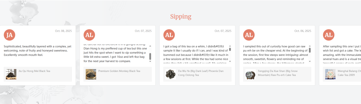 さらに、独立サイトにはユーザーの実際のレビューエリアも設けられています。各茶葉には多くの消費者が試飲後のリアルなフィードバックを残しており、これらのユーザー生成コンテンツは潜在ユーザーの購入への不安を解消し、次の購入への転換を促進します。