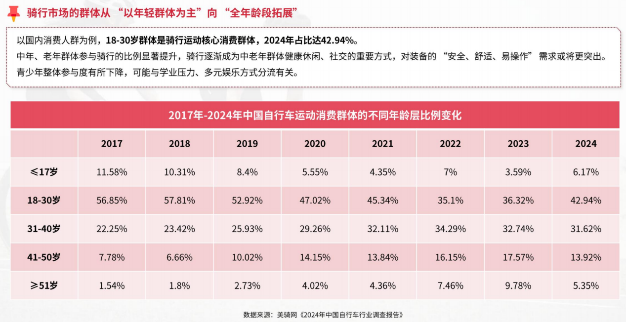 さらに、サイクリング市場の消費者層は若者から全年齢層へと拡大しており、中高年層は「安全・快適・操作しやすい」装備へのニーズが高まっています。