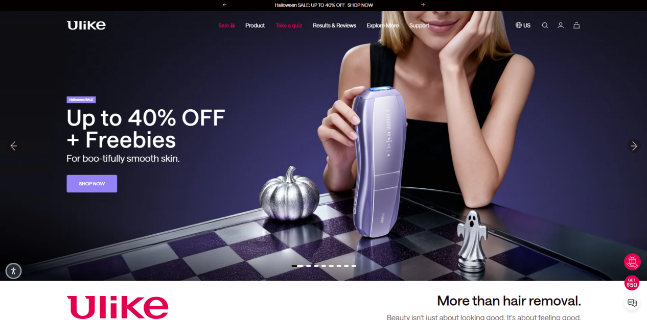 独自サイトのトップページでは、Ulikeブランドは目立つフォントで、サイト経由で脱毛器などを購入すると最大40%オフ+プレゼントがあることを全ユーザーにアピールし、注文転換を大きく促進しています。