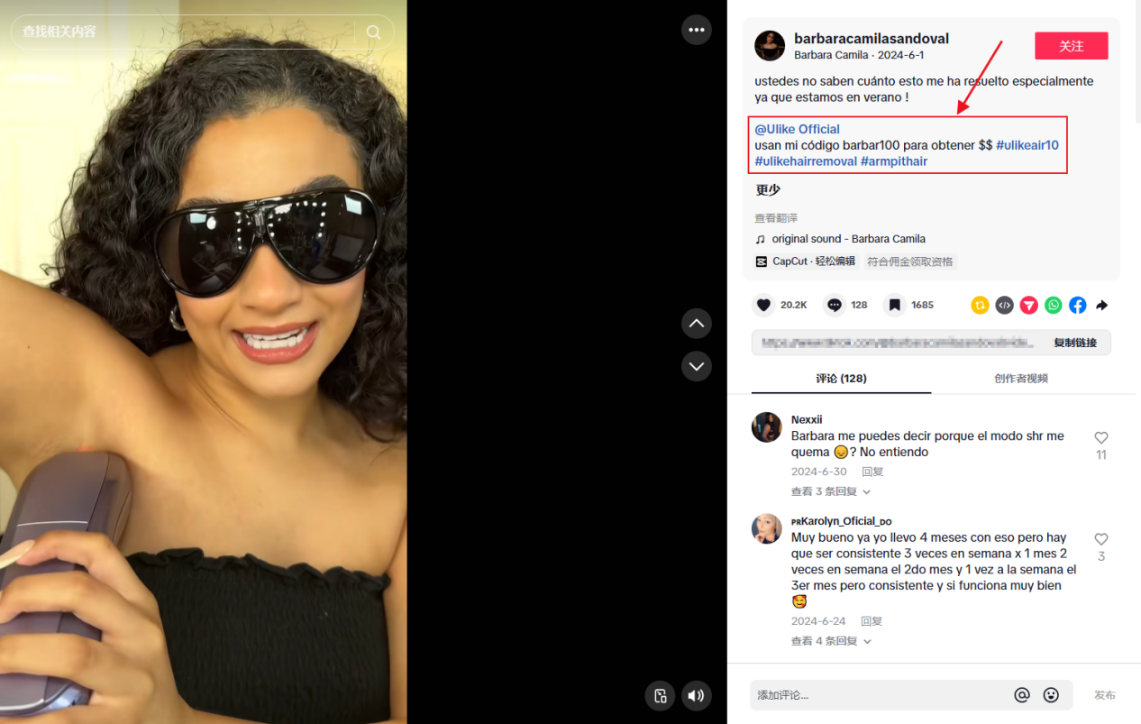 72.32万人のフォロワーを持つTikTokビューティーインフルエンサー@barbaracamilasandovalは、Ulikeブランドの脱毛器のリアルな使用動画を撮影しました。この動画のキャプションや内容は非常に典型的な例です。