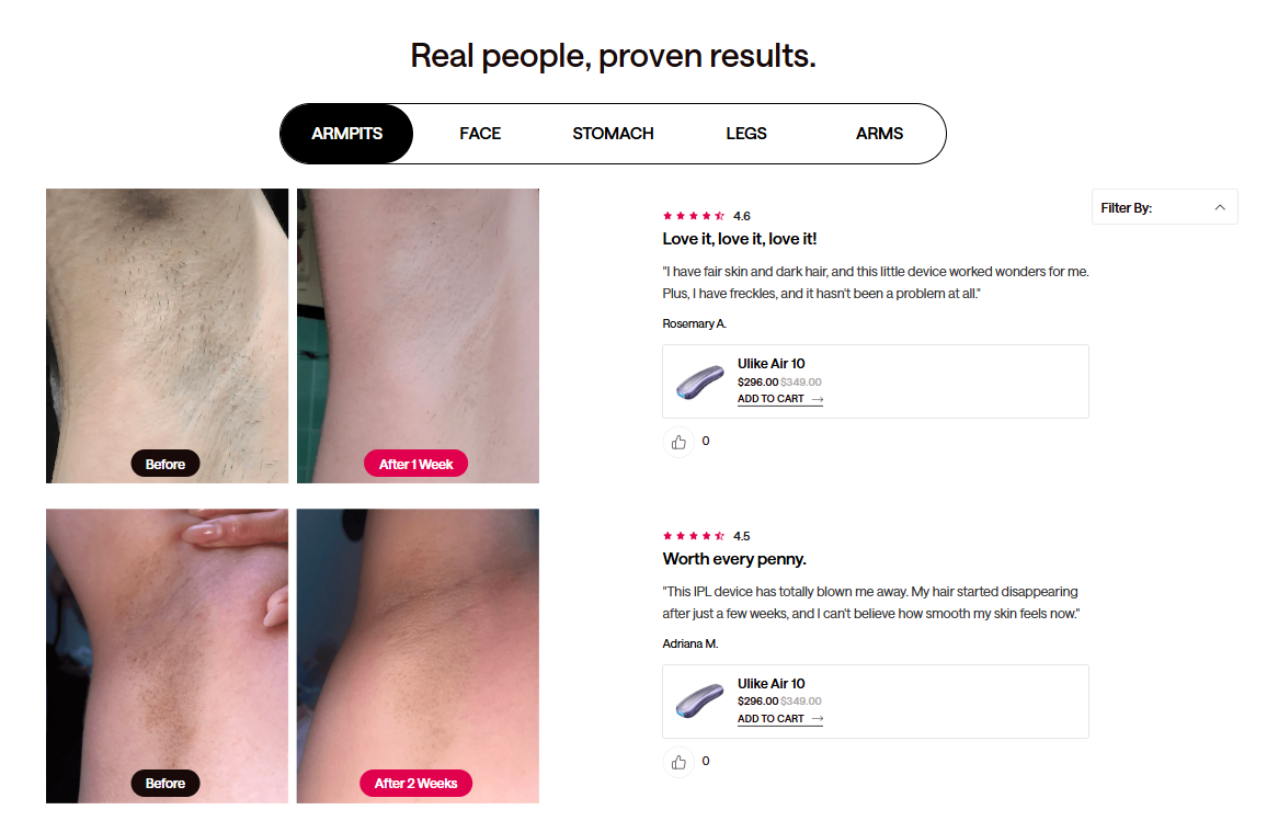 サイト内には、Ulikeブランドの実際のユーザーによるシェアコーナーも設けられており、さまざまな地域のユーザーが脱毛器を使用した後のリアルなフィードバックが掲載されています。部位は脇、顔、お腹、脚、腕などで、未購入ユーザーの参考や比較になり、好感度や購入信頼の向上に役立っています。