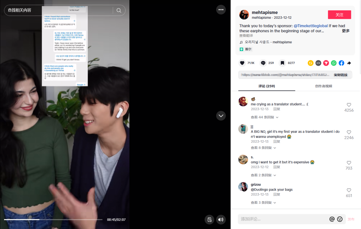 39.44万人のフォロワーを持つ韓国・トルコの国際カップルアカウント@mehtapismeは、Timekettleブランドのために、翻訳イヤホンを使って障壁なくコミュニケーションする様子を紹介する動画を撮影し、多くの異国生活ユーザーの共感を呼び、7万回以上の「いいね」を獲得しました。
