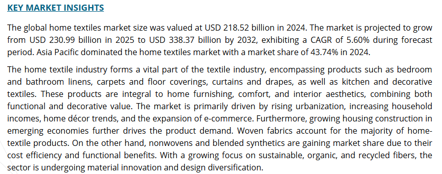 市場調査によると、2024年の世界家庭用繊維市場規模は2185.2億ドルに達し、2032年には3383.7億ドルに上昇する見込みで、年平均成長率は5.60%です。