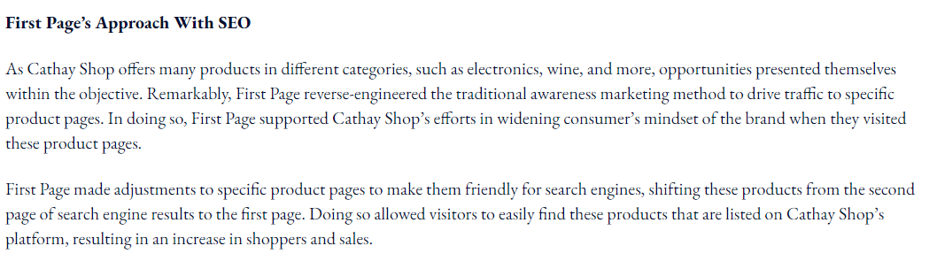 彼らは具体的な商品ページを特定のロングテールワードに対して細かく最適化しました。その結果、もともと2ページ目だった商品ページが一気に1ページ目に上がりました。ユーザーはピンポイントなキーワードで検索して来訪し、購買意欲が非常に高く、航空券を探していた人がそのままモール利用者になりました。