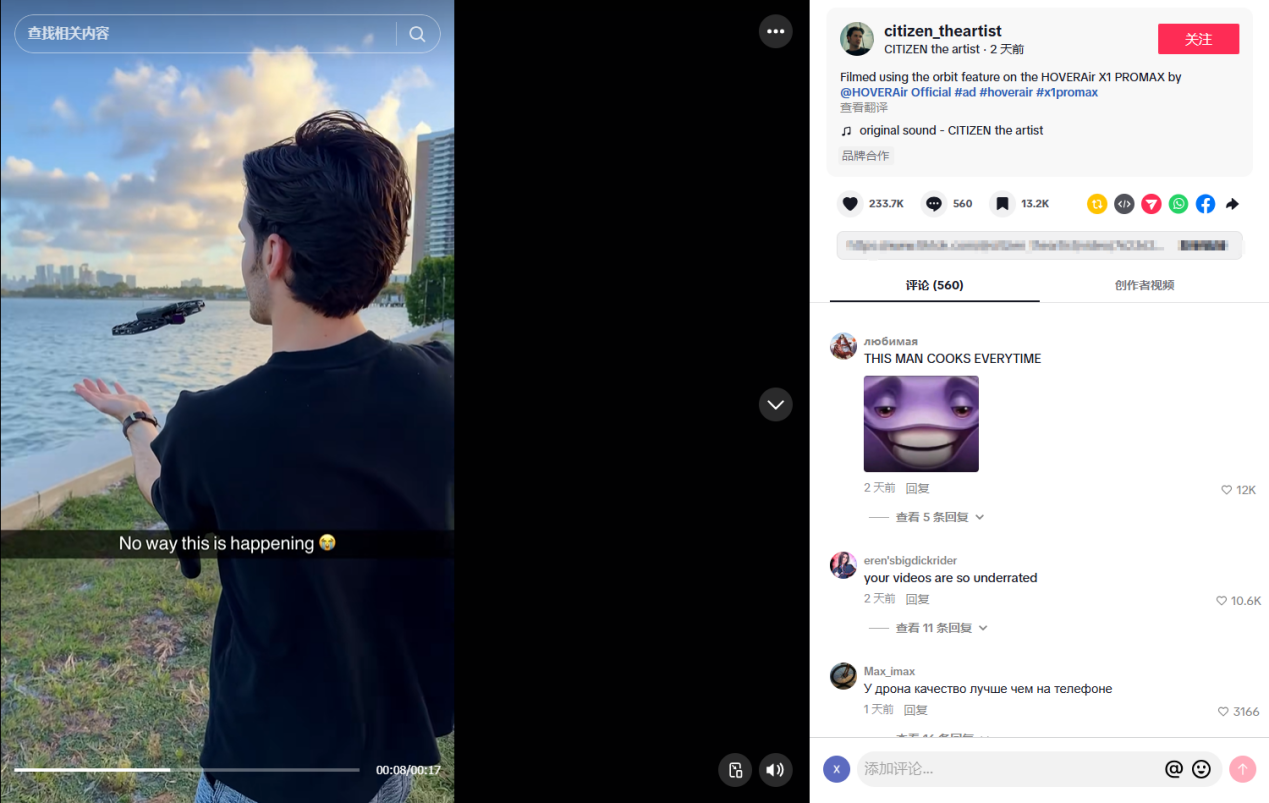 ブランド認知度をさらに高め、より多くのニーズのあるユーザーに製品を知ってもらうために、HoverAirブランドはTukeなどの主流SNSプラットフォームをコアマーケティング拠点とし、SNSチャネルでの爆発的な露出によってブランドの声とターゲット層を拡大しています。