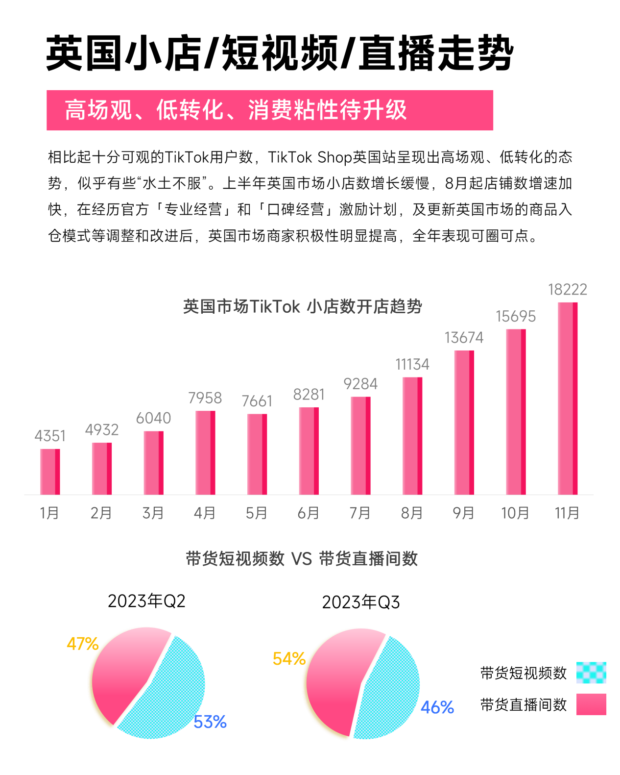 一年を通してTikTok Shopは東南アジア各国で成長傾向を示し、特に下半期には成長速度が顕著に加速しました。その中でもタイとマレーシアは8月に前月比40%以上の成長を記録し、市場のパフォーマンスが際立っています。しかし、欧米市場、特に英国市場は一年を通して成長が芳しくありませんでした。TikTokが2023年に掲げたEC目標230億ドルという壮大なビジョンに対し、英国市場のパフォーマンスは明らかに満足できるものではありません。