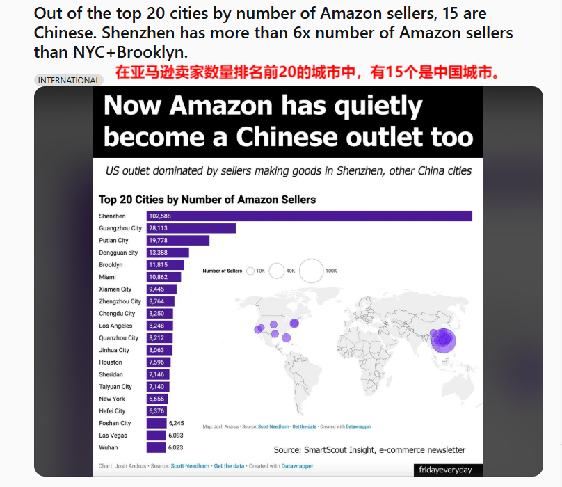 アマゾンセラー数上位20都市のうち、Tuke都市が15都市を占めています。その中でも、深圳は驚異的なセラー数で世界のアマゾンセラー集中度が最も高い都市となり、その規模はニューヨークとブルックリンの合計の6倍です。