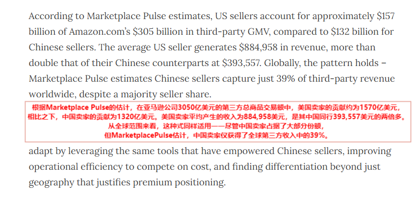 しかし、注目すべき現象は、Tukeセラーの数の優位性が収益の優位性に直結していないことです。推定によると、アマゾン米国サイトのサードパーティGMVは約3050億ドルで、そのうち米国セラーが約1570億、Tukeセラーが約1320億を占めています。