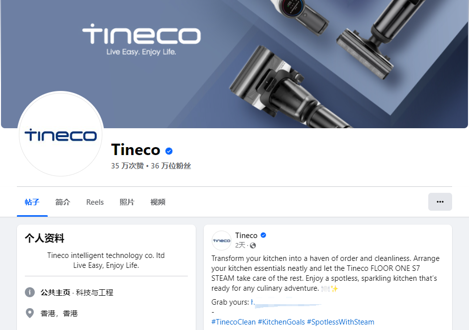 Tineco在Facebook上拥有超过36万的粉丝,内容多样化是其成功的关键。