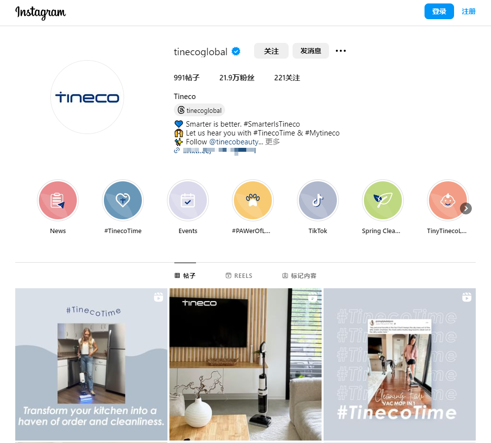 Instagram作为视觉化的社交平台,Tineco在这里更多地展示了产品的时尚设计和实际应用场景。与KOL合作,通过高质量的视觉内容和生活方式的展示,Tineco成功吸引了21.8万粉丝。