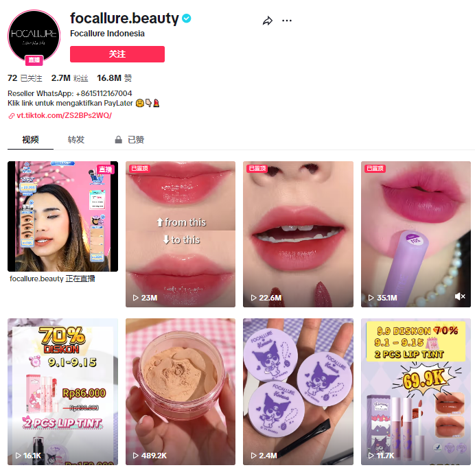 面对印尼市场的需求,Focallure将TikTok作为了主要宣传渠道。印尼账号@focallure.beauty目前拥有270万粉丝,并开展了直播带货,成功打造了一个强大的品牌矩阵。