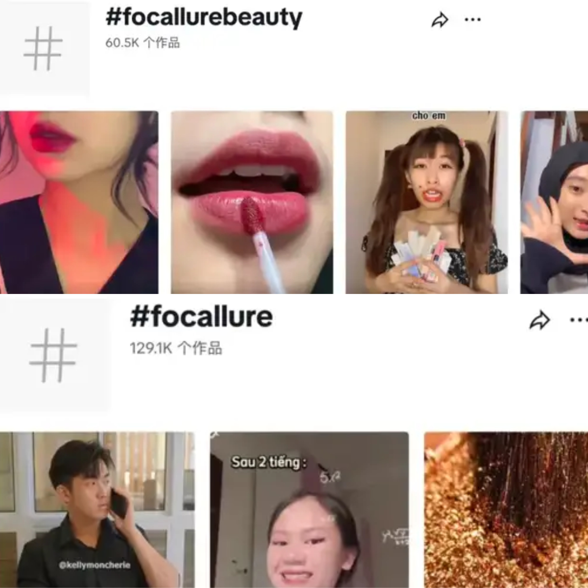 在TikTok上,#focallurebeauty和#focallure这两个标签下的视频数量分别超过6万和13万。