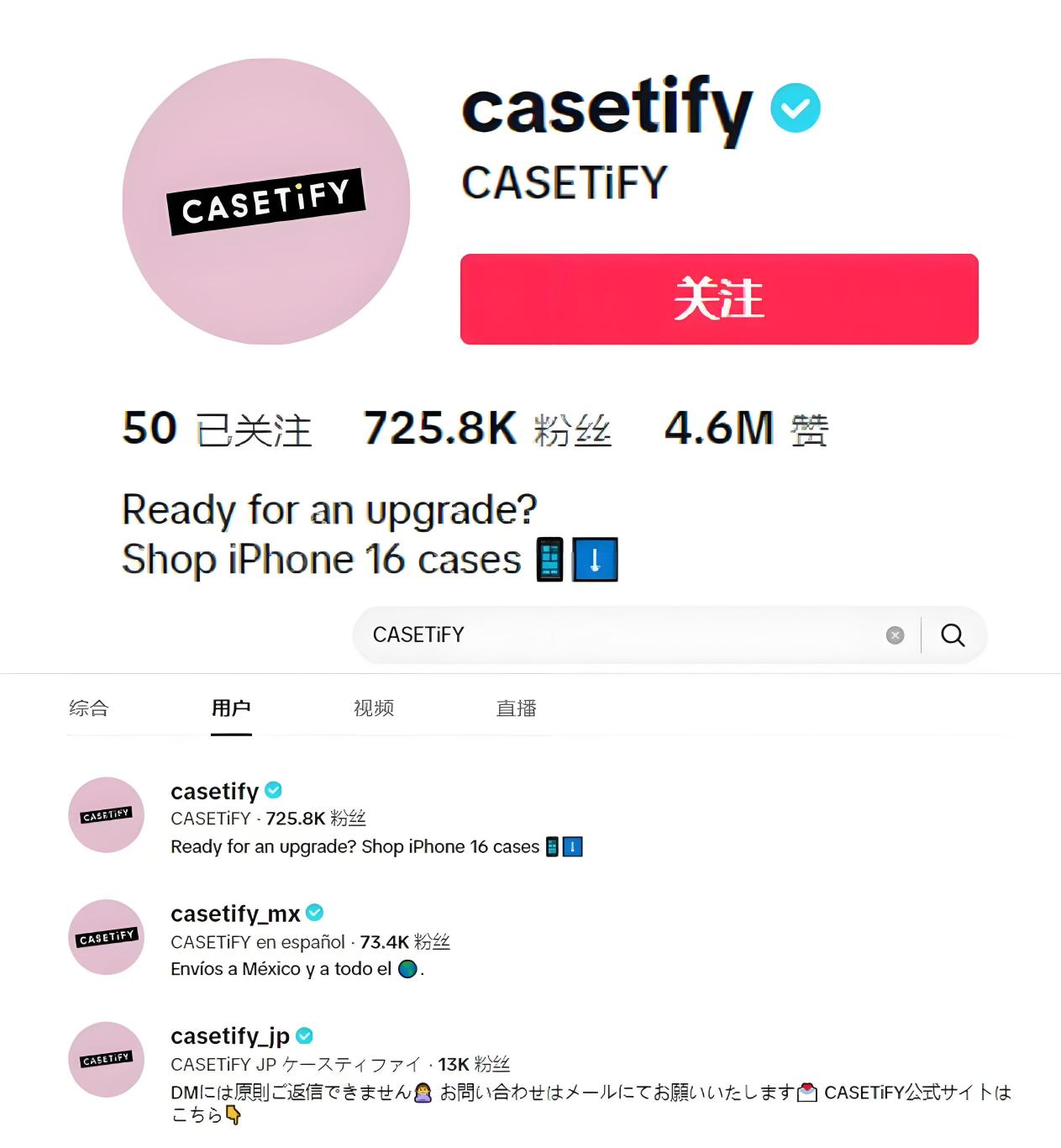 CASETiFY TikTok主账号及次账号粉丝数一览