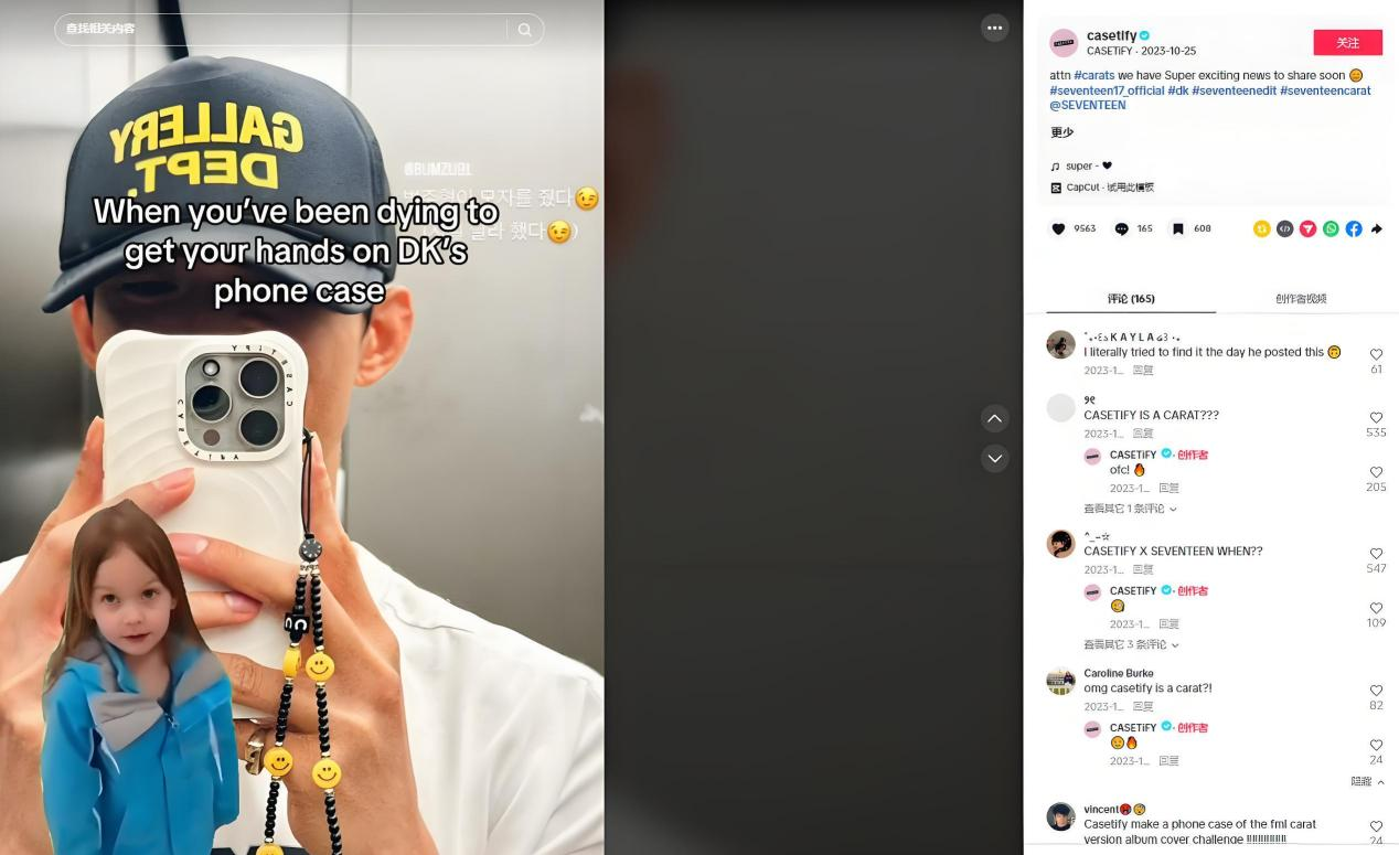 CASETiFY之前发布的一条关于韩流明星组合SEVENTEEN成员使用同款手机壳的视频,就吸引了很多粉丝前来观看、评论。